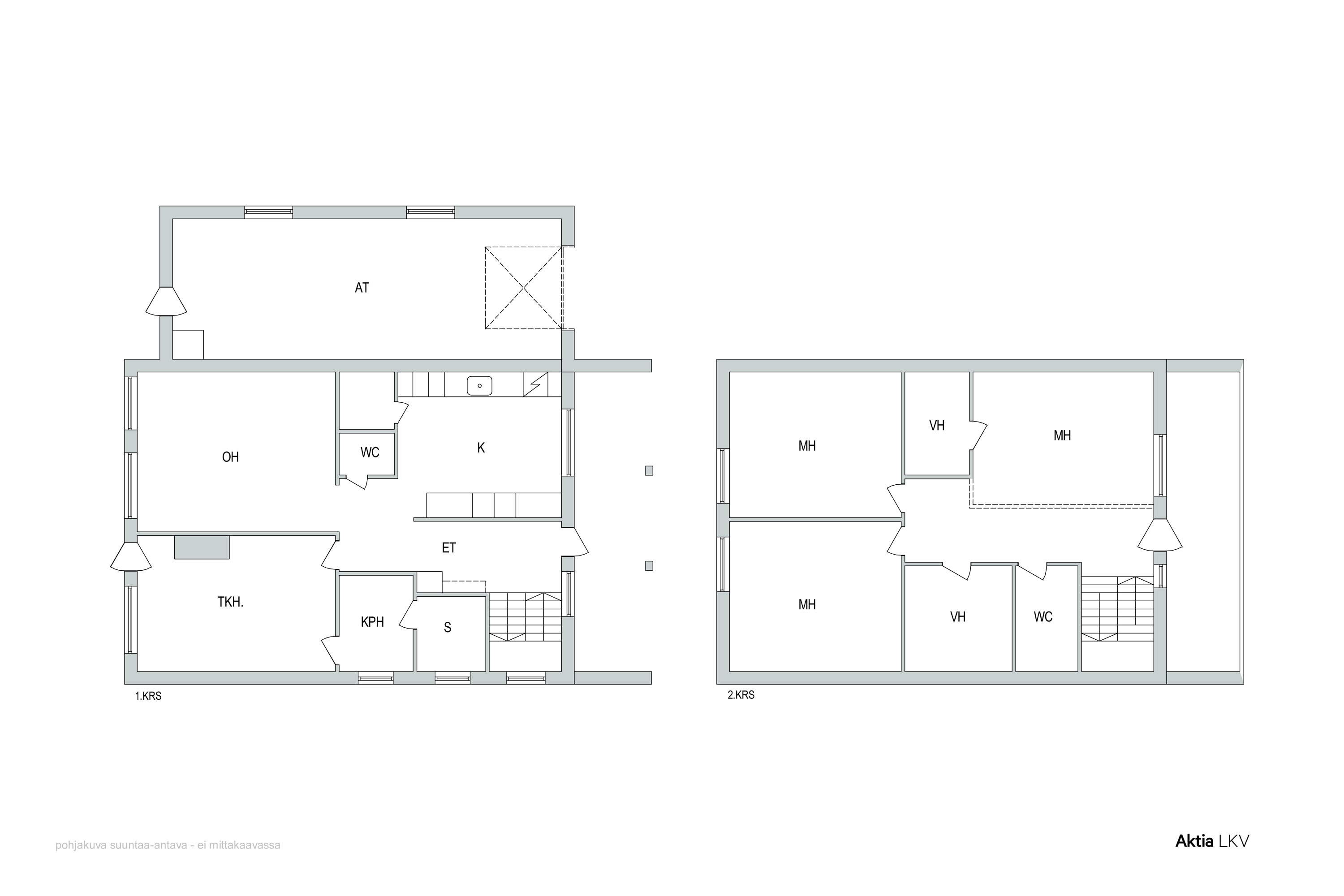 Säilytystilaa tarjoavat kaksi vaatehuonetta, ja ja vintti. Arkea helpottaa myös yläkerran wc.