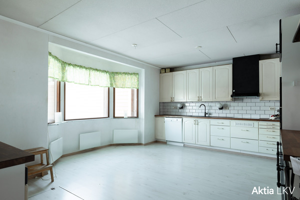 Talossa on avara ja reilunkokoinen olohuone, jossa takkasyvennys luo tunnelmaa. Tilava keittiö avautuu oleskelutiloihin, ja sen yhteydessä oleva erillinen “apukeittiö” toimii mainiosti ruokakomerona tai kodinkoneiden säilytystilana.