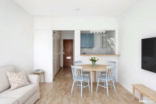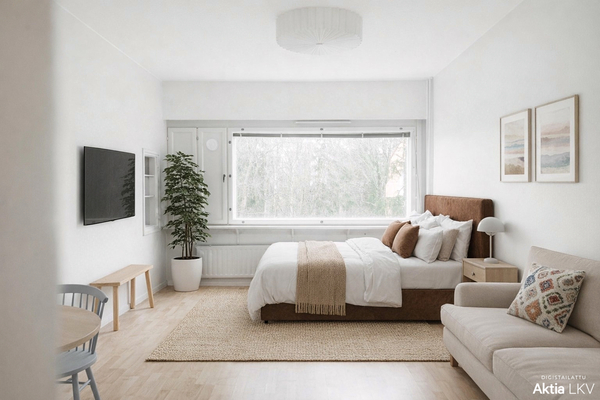 Huone jossa on iso ikkuna ja keittokomero, joka on avoin huoneeseen. Kylpyhuone on päivitetty vuonna 2013 putkiremontin yhteydessä. Huoneistoon kuuluu tilava kellarikomero.