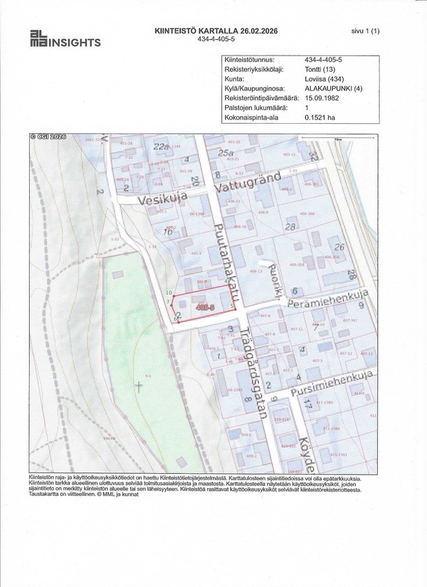 Omalla puutarhatontilla on pinta-alaa peräti 1521m2 ja sillä sijaitsee myös vanha, hieno vajarakennus sekä vierasmökki/-talo. Tontilla on vain yksi rajanaapuri pohjoista rajaa pitkin. Tontin yläpuolella Loviisan kaunis harju ulkoilumaastoineen ja Peämiehenkujan alkupäässä Loviisanlahden ranta venepaikkoineen ja vähän matkan päässä löytyy suositut ranta-aitat kesäravintoloineen.
