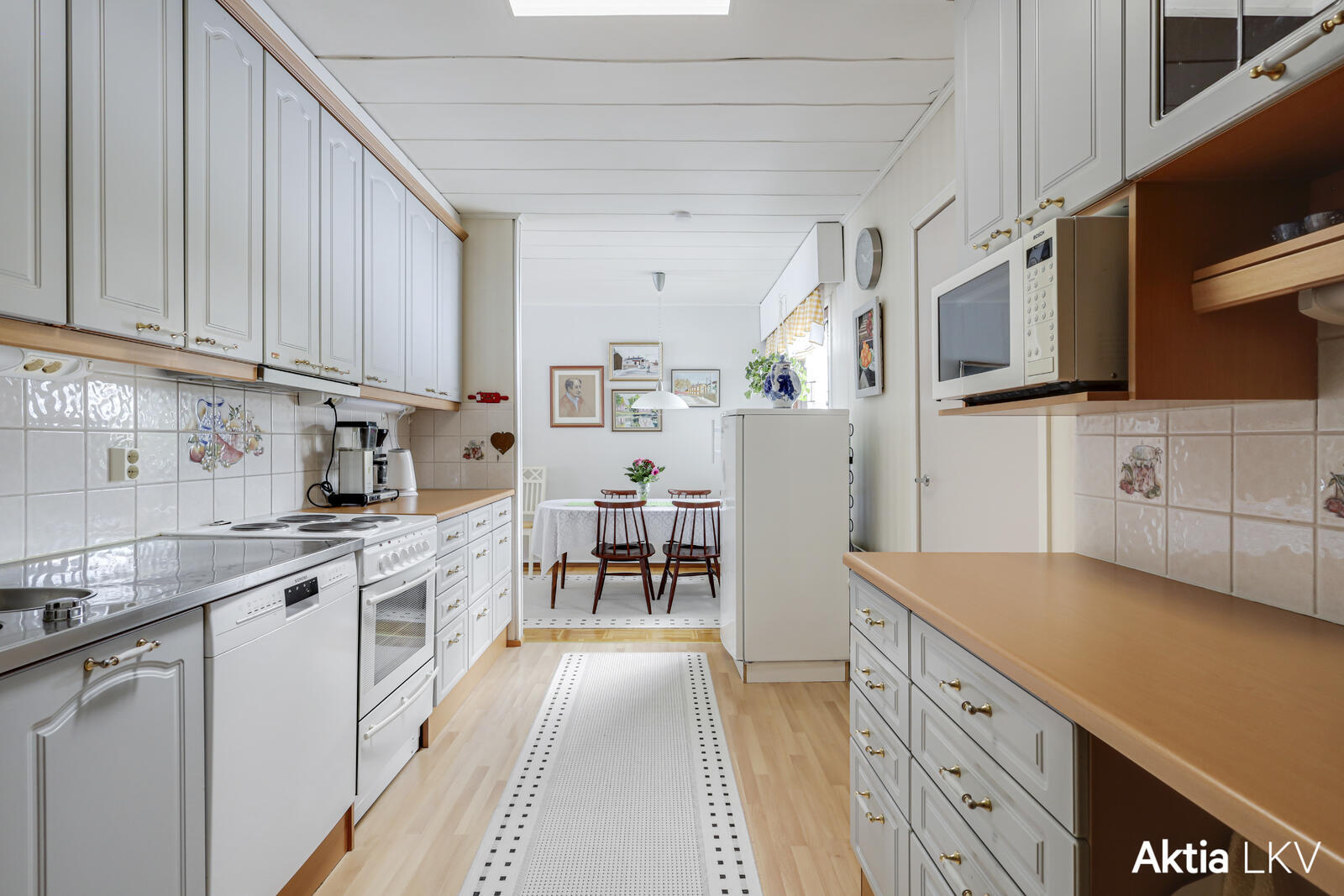 Keittiössä on hieno Parmakeittiö ja se tarjoaa sekä kauniin että käytännöllisen tilan kokkailuun ja yhdessä oloon. Asunnon parkettilattia kiiltää ja muutkin pinnat hohtaa uutuuttaan.