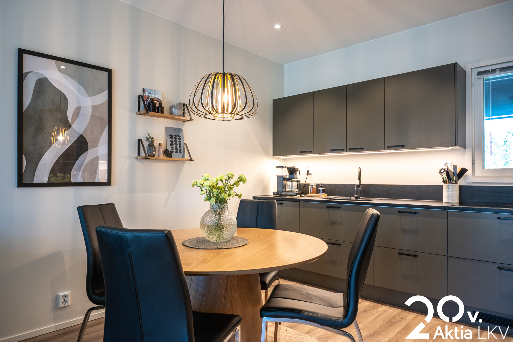 Keittiö ja olohuone muodostavat avaran ja kutsuvan kokonaisuuden, jossa valo tulvii sisään ja luo lämpimän tunnelman. Kauniisti suunniteltu keittiö on täydellinen paikka niin arjen askareisiin kuin yhdessäoloon perheen ja ystävien kanssa.