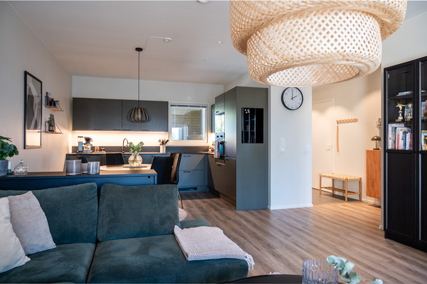 Kök och vardagsrum smälter samman till ett öppet och inbjudande utrymme. Ljuset flödar in och skapar en varm atmosfär, och det snygga köket med sina genomtänkta materialval blir en naturlig plats för både vardag och umgänge.
