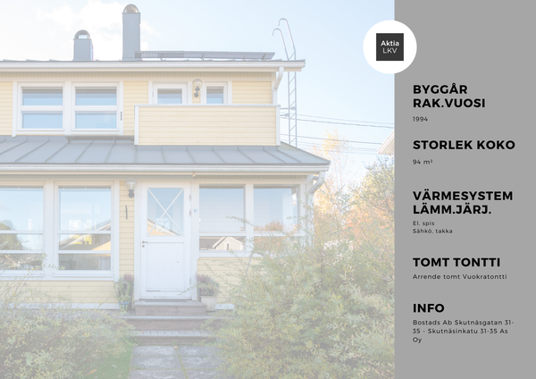 Asunto kuuluu pidettyyn ja hyvin hoidettuun taloyhtiöön Skutnäsissä, vain lyhyen kävelymatkan päässä merestä ja tunnelmallisesta Vanhasta satamasta. Autokatos ja varasto sisältyvät kokonaisuuteen.