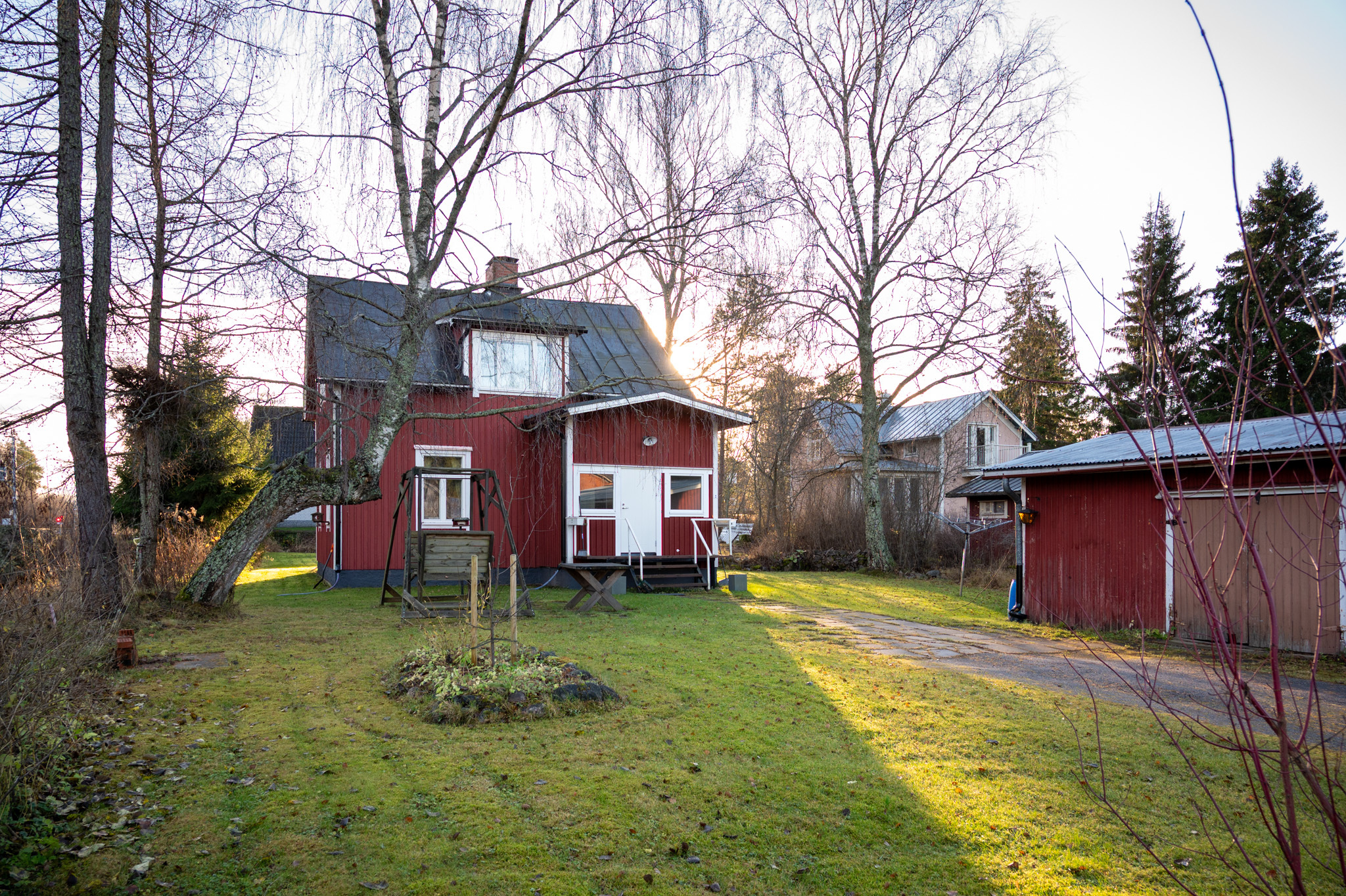 På tomten finns även en uthusbyggnad med praktiska förrådsutrymmen, perfekt för förvaring eller hobbybruk.