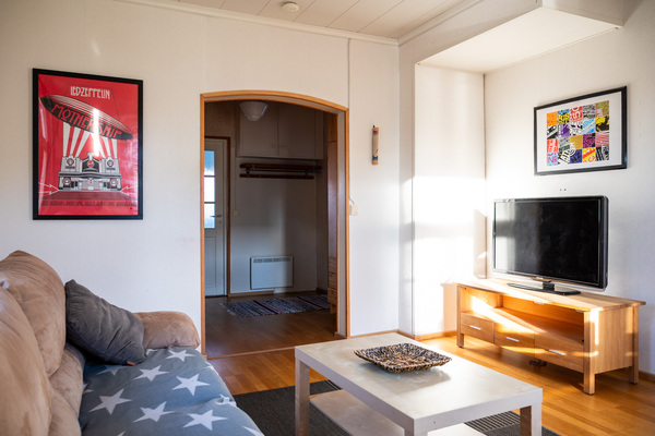 Bottenvåningen omfattar vardagsrum, sovrum, kök, badrum och wc. På övre våningen finns ytterligare ett sovrum, ett arbetsrum samt ett allrum. Den totala bostadsytan uppgår till cirka 80 m² vilket gör huset lagom stort och lättskött.