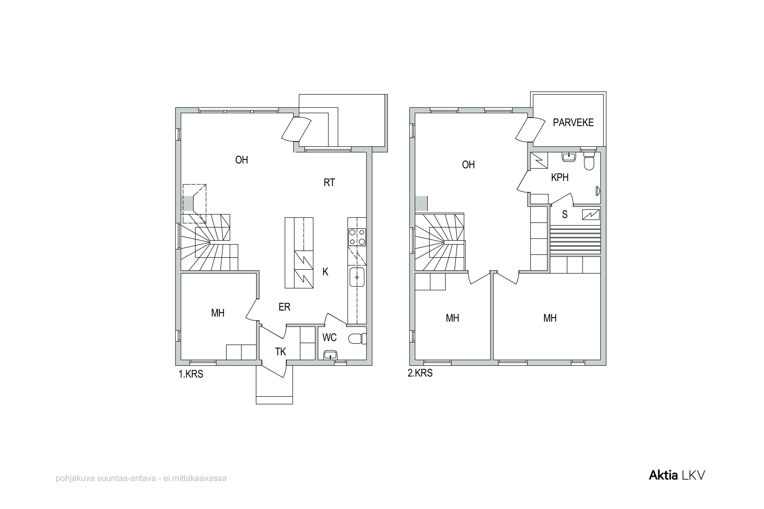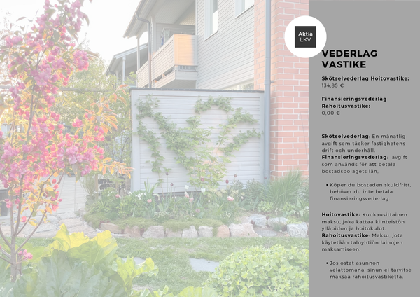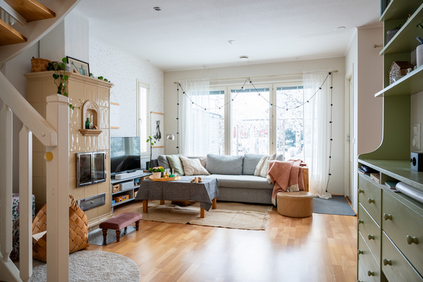 Asunto on kahdessa kerroksessa. Alakerrassa sijaitsevat keittiö, wc, makuuhuone sekä viihtyisä olohuone, jonka katseenvangitsijana toimii samppanjanvärinen kaakeliuuni, tuoden tilaan sekä lämpöä että tunnelmaa. Yläkerrassa on oleskelutila, kaksi makuuhuonetta, kylpyhuone sekä parveke.