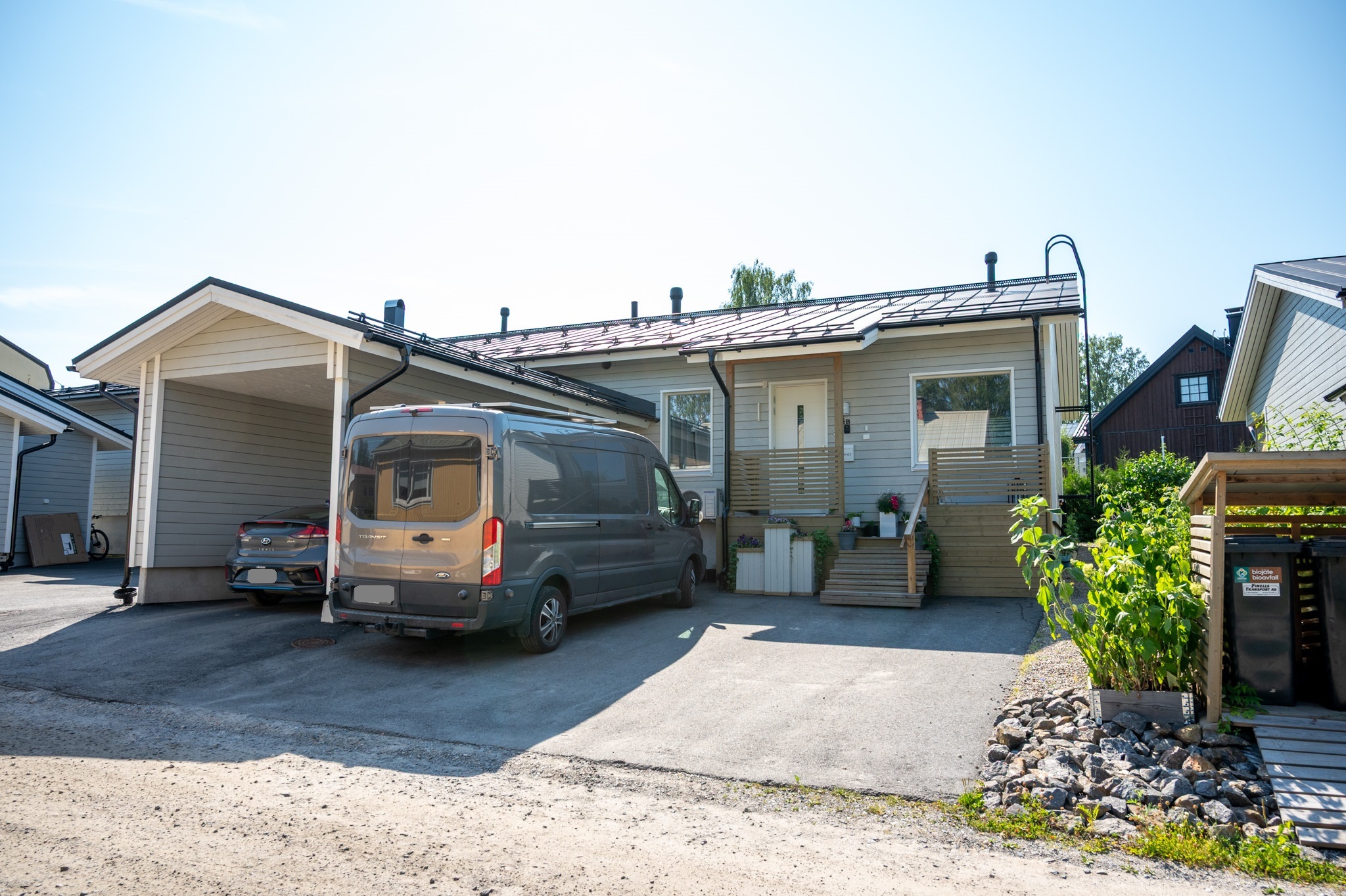 Asuntoon kuuluu myös reilun kokoinen autokatos, johon mahtuu jopa 6,5 metriä pitkä matkailuauto sekä runsaasti säilytystilaa. Asfaltoitu piha-alue tekee arjesta helppoa ja huolettomampaa ympäri vuoden.