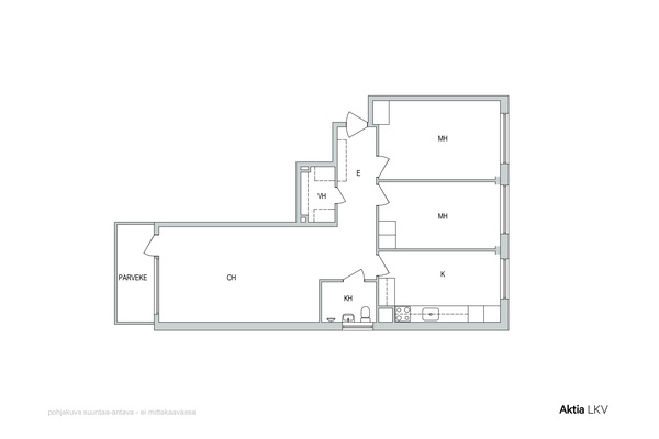 Toimivan pohjaratkaisun omaava päätyhuoneisto.