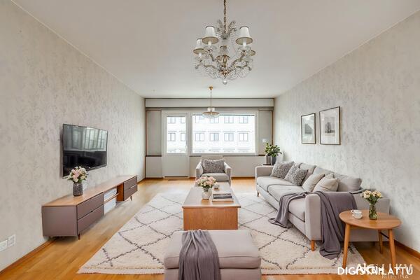 Tilava, noin 30 m²:n olohuone tarjoaa erinomaiset puitteet niin oleskeluun kuin yhdessäoloon – tilaan mahtuu vaivatta sekä näyttävä sohvaryhmä että suurempikin ruokailuryhmä. Asunnossa on lisäksi kaksi hyvänkokoista makuuhuonetta sekä keittiö, jossa on runsaasti kaappitilaa.