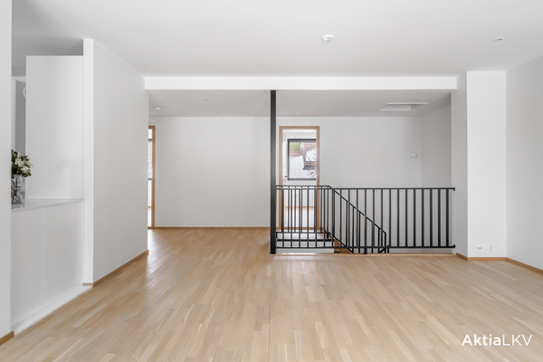 Yläkerran suuri olohuone toimii kodin sydämenä ja siitä on kulku parvekkeelle. Valkoinen, ajaton vedinurallinen keittiö integroiduilla kodinkoneilla yhdistyy luontevasti ruokailutilaan. Yläkerrassa on lisäksi kaksi makuuhuonetta sekä wc. Mahdollisuus lisätä toiseen makuuhuoneeseen väliseinä jolloin saa yhden lisähuoneen.