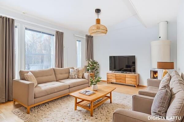 Avara keittiön ja olohuoneen kokonaisuus yhdistyy luontevasti keittiösaarekkeen ja ruokailutilan kautta, ja olohuoneen pönttöuuni tuo sekä tunnelmaa että miellyttävää lisälämpöä. Kodissa on tilavat makuuhuoneet sekä käytännöllinen kylpyhuone ja oma sauna rentoutumiseen.