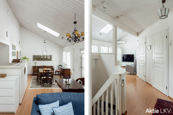 Högt i tak, luftigt, ljust vardagsrum med fin rymd.