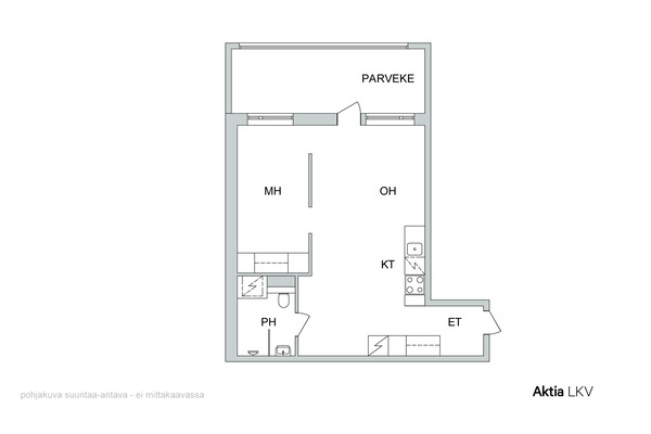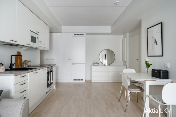 Asunnon sydän on avokeittiön ja olohuoneen muodostama yhtenäinen, valoisa tila, jonka kruunaa koko asunnon levyinen lasitettu parveke, jossa viihtyisää oleskelutilaa ympäri vuoden.
