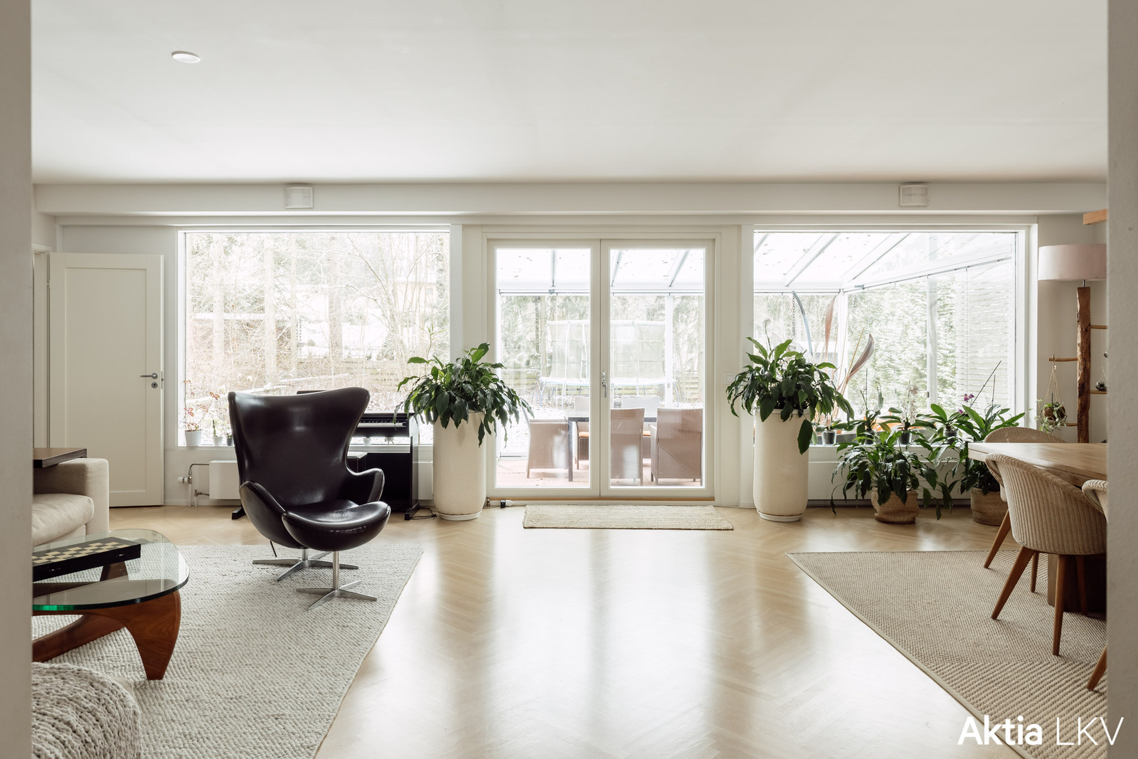 Det moderna köket är smakfullt utformat och öppnar sig mot den ljusa matplatsen, vilket ger en inbjudande miljö för både vardag och fest. Vardagsrummet öppnas mot en cirka 30 m² stor inglasad glasterrass under tak, som fungerar som ett härligt extrarum större delen av året.