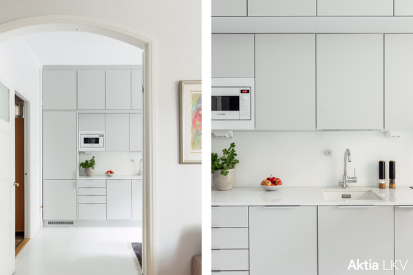 Kaunis kaariovi yhdistää keittiön ja olohuoneen, luoden tilaan viehättävää vanhan talon tunnelmaa. Keittiö on uusittu vuonna 2024, ja sinne mahtuu hyvin ruokapöytä arjen ruokailuhetkiä varten. Kylpyhuoneessa on mukavasti tilaa myös pesukoneelle.