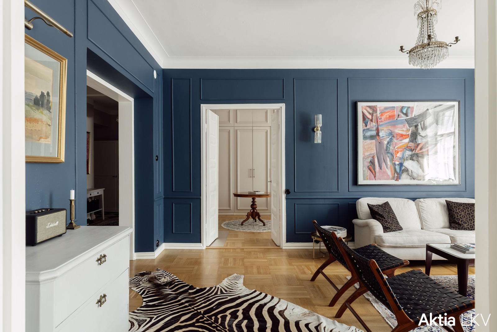 Bostaden erbjuder vid behov upp till fyra sovrum. Köket är rymligt i ljusa toner. Det finns två badrum, varav det ena har bastu och badkar utöver duscharna. Lägenheten har platsbyggda förvaringslösningar och infällda speglar som reflekterar ljuset på ett vackert sätt. I de större rummen finns äkta parkettgolv, och i matsalen en fungerande öppen spis.