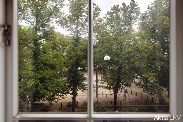 Högklassigt renoverad familjebostad med parkutsikt i en 1920-talets byggnad ritad av arkitekten Lars Sonck.