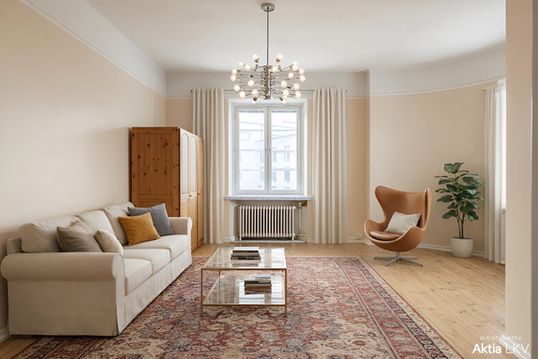 Upea huoneisto 1927 rakennetun talon ylimmässä kerroksessa (6/6) arvostetussa Etu-Töölössä. Asunto sijaitsee rauhallisen sisäpihan puolella; oma rauha ja taivas kattona.