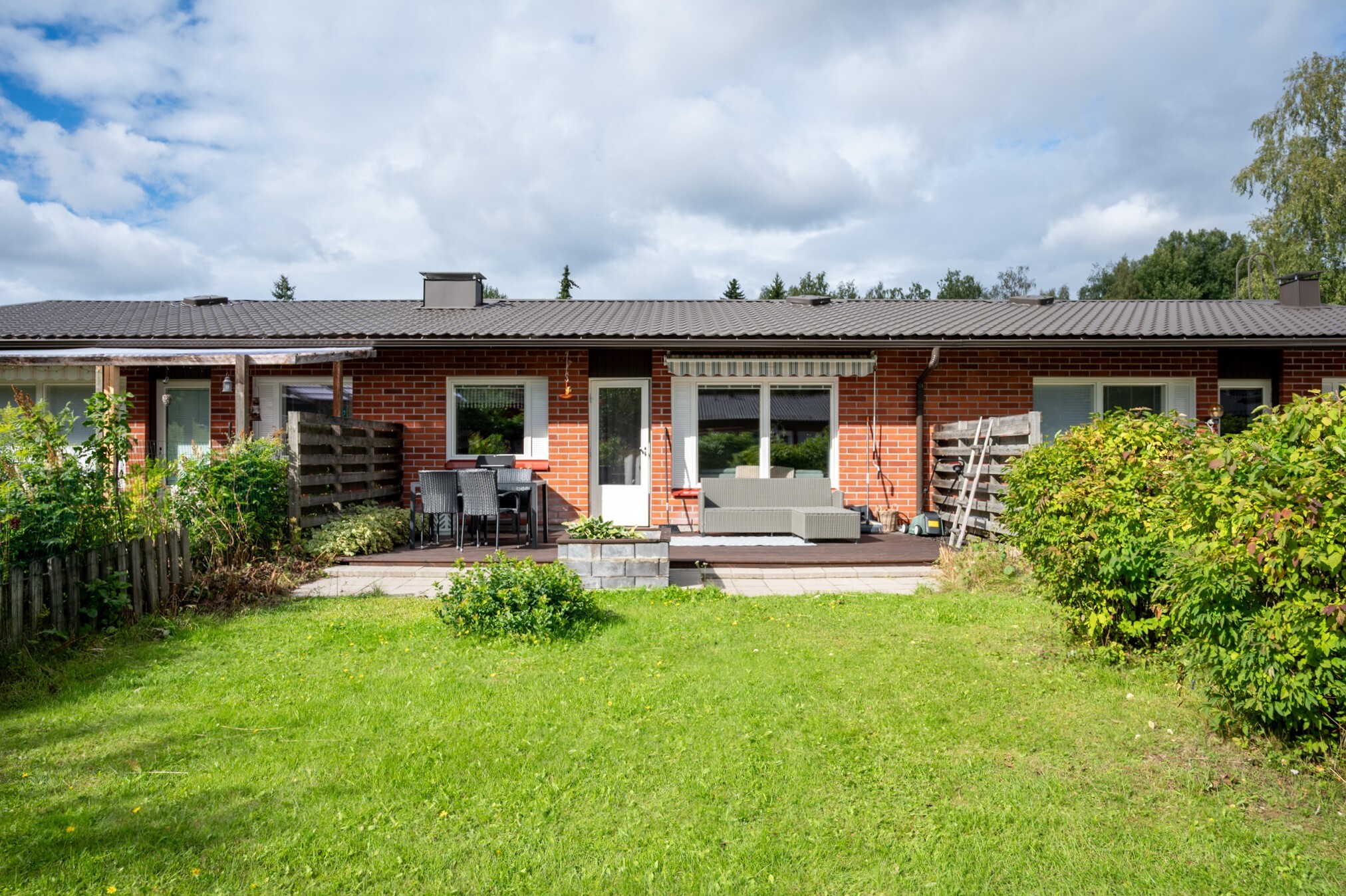 Denna radhuslägenhet om 60,5 m² bjuder på en välplanerad planlösning och en bakgård som är en riktig dröm, solig och rymlig med en stor terrass. Delar av gården ramas in av staket och buskar, vilket ger en skyddad och hemtrevlig känsla.