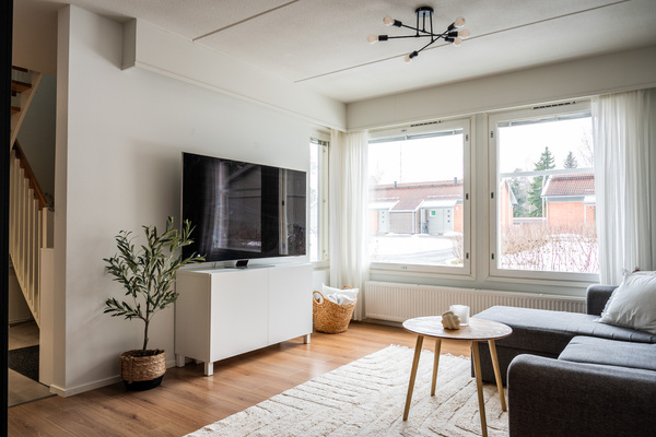 Bostaden erbjuder 79 m² med tre rum och kök, badrum, bastu och separat wc. På övre våningen hittar du sovrummen, badrummet med bastu och en balkong – en perfekt plats att njuta av morgonkaffet. Bottenvåningen har öppna, inbjudande sällskapsytor med kök och separat wc, idealiskt både för vardagsliv och umgänge.