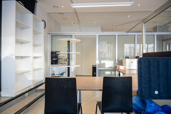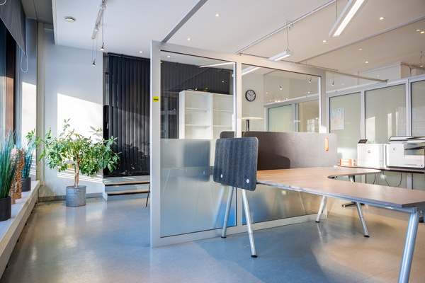 Lägenheten är idag inredd för kontorsverksamhet, med mötesrum och flera arbetsplatser, ljusa materialval och glasväggar som avskiljare. Väggarna går att ta bort om man vill ha ett helt öppet utrymme.