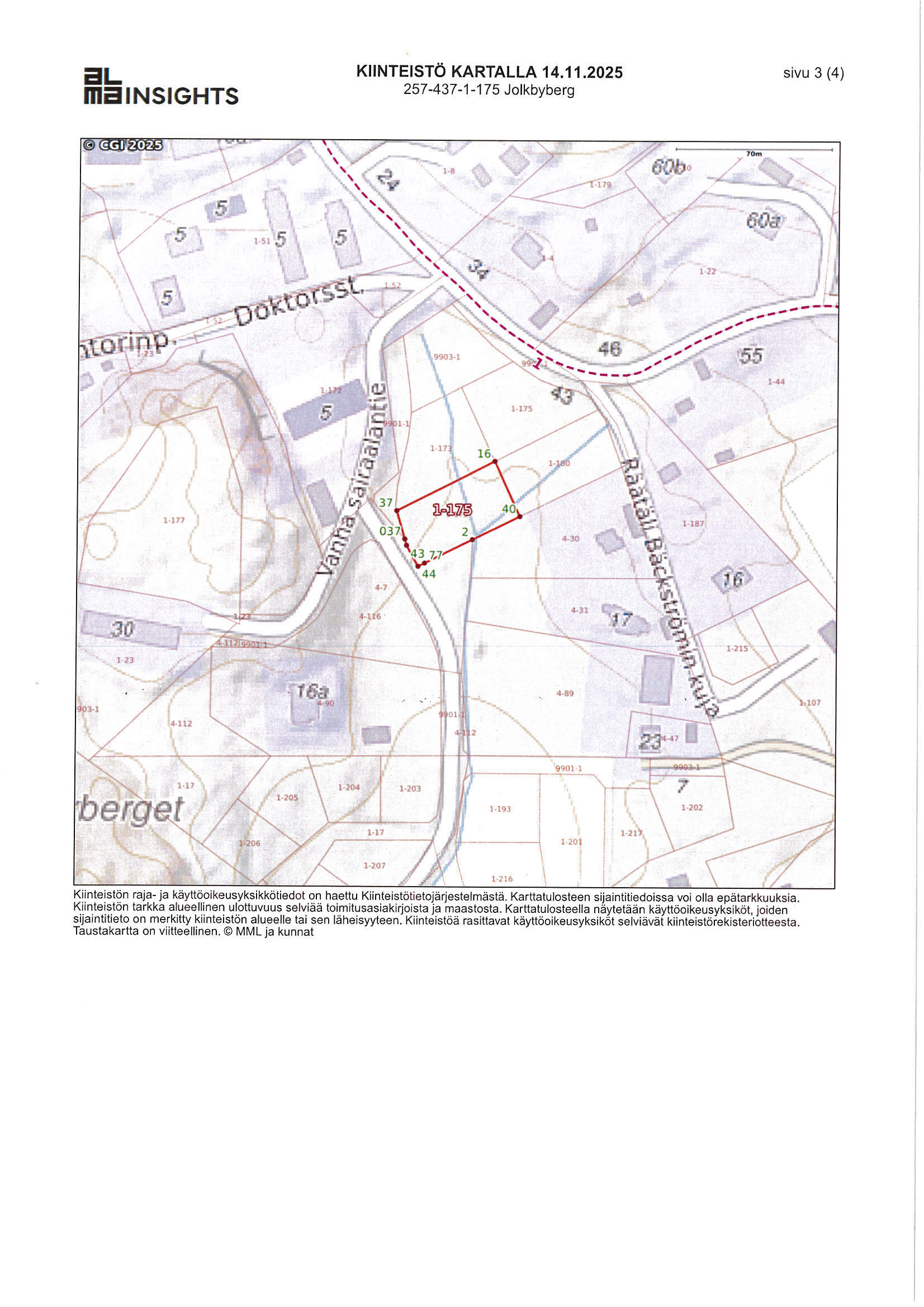 Rakennusoikeus yhdelle omakotitalolle enintään 180 k-m² + sivurakennus enintään 50 k-m² + talousrakennuksia enintään 70 k-m². Kunnallistekniikka tontin rajalla.