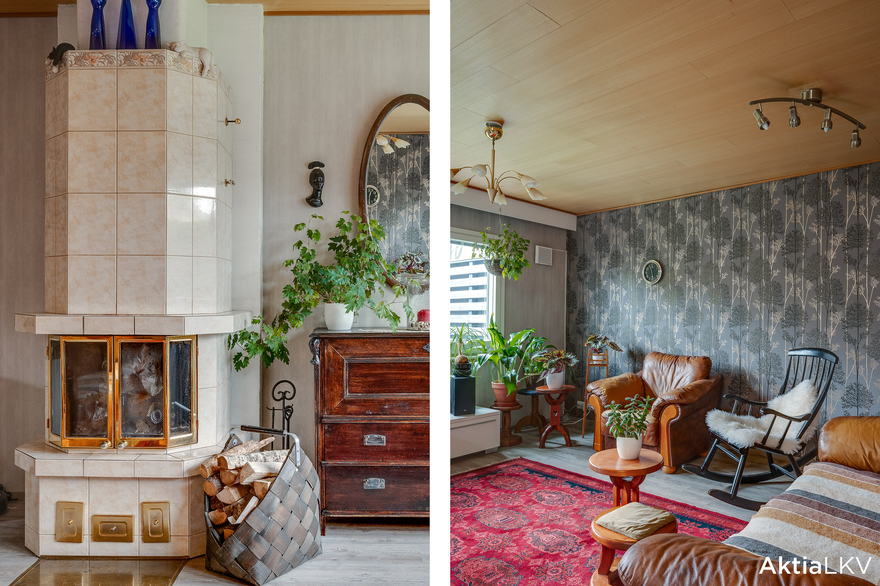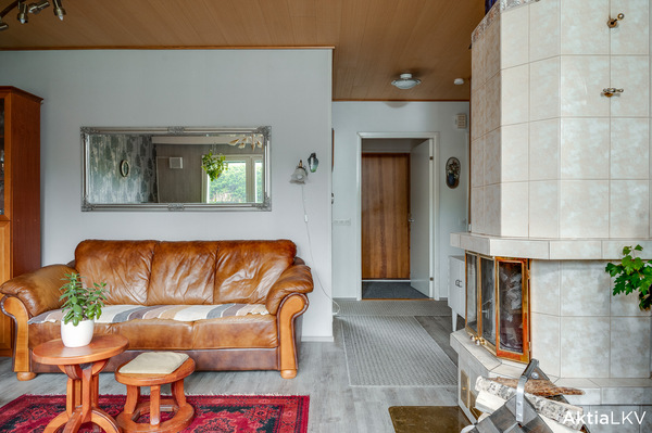 Olohuoneessa kaunis kaakelipintainen varaava takka tuo tilaan lämpöä ja tunnelmaa.